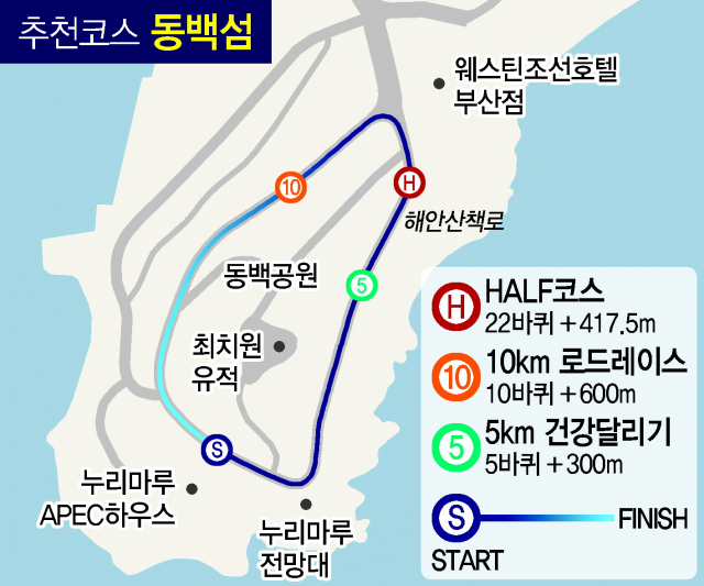누리마루APEC하우스 앞에서 출발한다고 가정하면 5km 건강달리기 부문 참가자는 다섯 바퀴를 돌고 300m 정도 더 달리면 된다. 10km 로드 레이스 참가자는 10바퀴에 추가로 600m, 하프 코스 도전자는 22바퀴를 뛴 뒤 417.5m가량 더 달리면 완주할 수 있다. 시원한 풍광과 바닷바람을 맞으며 달릴 수 있는 게 장점이다.