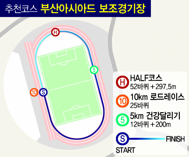 부산 동래구나 금정구, 부산진구에 거주하는 초보 ‘달리미’들에게는 연제구 거제동 부산아시아드 보조경기장을 추천한다. 코스가 단조로운 단점이 있으나 400m 정규 육상 트랙이 설치돼 달리기에 안성맞춤이다. 5km 건강달리기 참가자는 12바퀴를 돌고 200m 더 달려야 하고, 10km 로드 레이스 참가자는 25바퀴를 달리면 된다. 하프 코스는 52바퀴를 돌고 297.5m 더 뛰어야 한다.