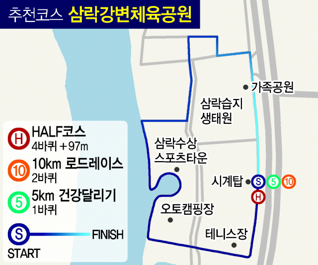 5km 건강달리기 참가자는 1바퀴, 10km 로드 레이스 참가자는 2바퀴, 하프 코스 참가자는 4바퀴를 돌고 추가로 97m 더 뛰면 된다.