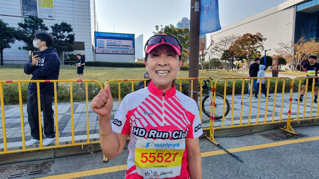 20년 경력의 마라토너인 추순남(65) 씨는 23일 펼쳐진 ‘성우하이텍 2022 부산바다마라톤’에서 5km 여자 종목 우승을 차지했다. 부산시립미술관 앞 5km 결승선을 통과한 추 씨의 표정에서는 여유가 느껴졌다. 추 씨는 결승선을 통과한 ‘현대런클럽’ 회원들에게 파이팅을 외치며 즐거운 표정을 지었다.