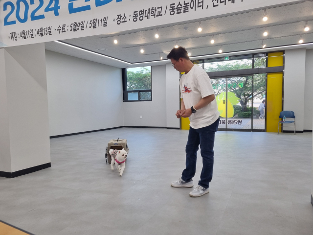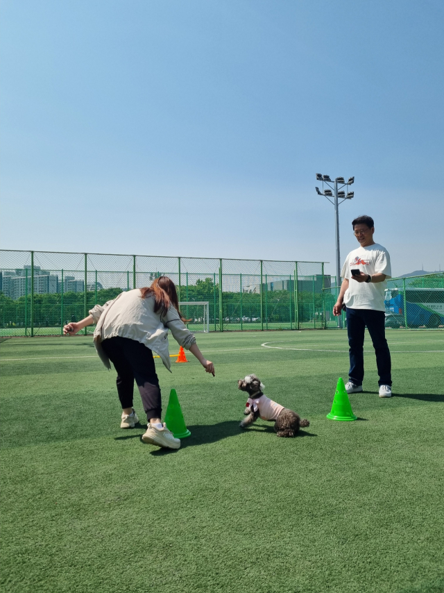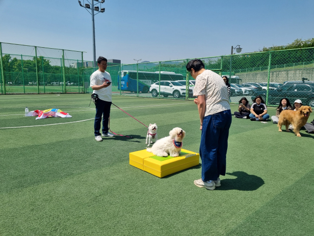 지난 9일 부산 남구 동명대학교 풋살경기장에서 진행된 마지막 수업은 앞서 4주 동안 배운 내용을 복습하고 반려견과의 유대 관계를 더욱 돈독히 하기 위해 미니운동회 형식으로 진행됐다. 이날은 운동회답게 동명대 반려동물보건학과 학생들이 관객으로 자리를 채웠다.