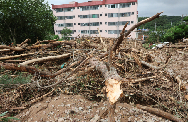 10일 폭우로 산사태가 나면서 전북 군산시 성산면 한 아파트 앞까지 나무가 밀려와 있다. 연합뉴스