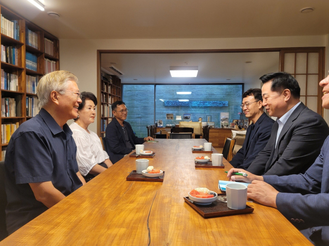 문재인 전 대통령이 11일 더불어민주당 8·18 전당대회 당대표 경선에 출마한 김두관 전 의원을 만났다. 문 전 대통령은 김 전 의원의 출마에 대해 “용기 있는 결단”이라며 “민주당에 도움이 될 것”이 격려했다.