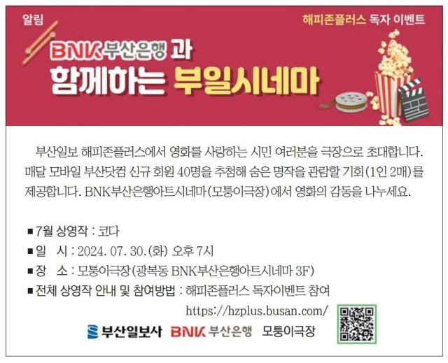 부산일보 해피존플러스에서 영화를 사랑하는 시민 여러분을 극장으로 초대합니다. 매달 모바일 부산닷컴 신규 회원 40명을 추첨해 숨은 명작을 관람할 기회(1인 2매)를 제공합니다. BNK부산은행아트시네마(모퉁이극장)에서 영화의 감동을 나누세요.