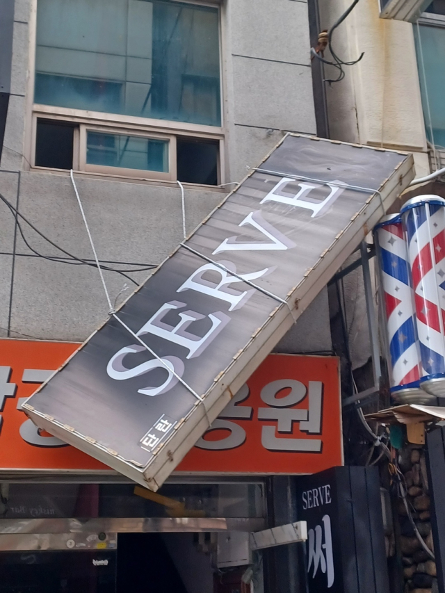 7일 부산 중구 중앙동에서 한 가게 간판이 강풍으로 인해 떨어져 나갔다. 부산소방재난본부 제공