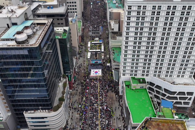 15일 오후 광주 동구 금남로에서 경찰버스로 만든 차벽을 사이에 두고 윤석열 대통령 탄핵에 찬성(아래쪽), 반대(위쪽)하는 집회가 각각 열리고 있다. 연합뉴스