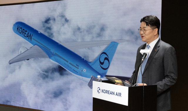 조원태 한진그룹 회장이 지난 11일 서울 대한항공 본사에서 열린 신규 CI 공개 기자간담회에서 에어부산 분리매각 반대 입장을 밝혔다. 연합뉴스