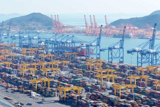 컨테이너 화물로 가득 찬 부산항 신항 전경. 부산일보DB
