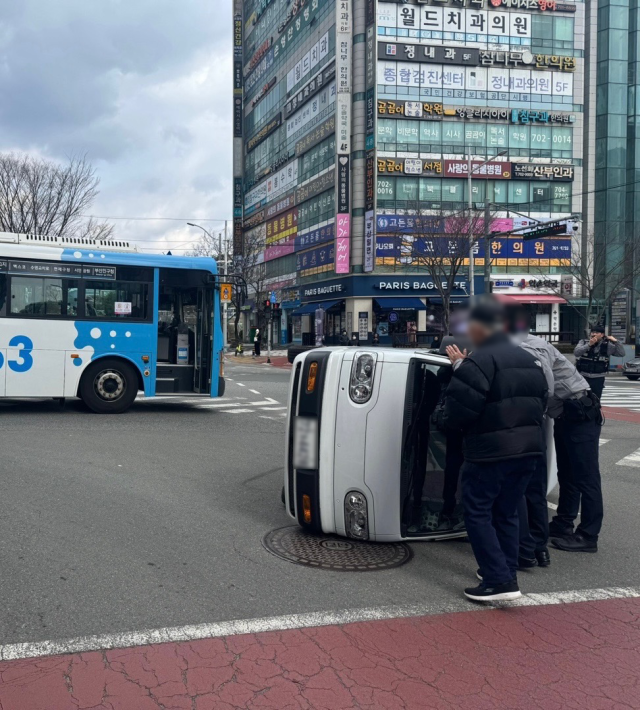 부산 해운대경찰서는 지난 7일 낮 12시 35분께 부산 해운대구 한 사거리에서 시내버스와 승합차가 충돌하는 사고가 났다고 13일 밝혔다. 교통신호가 바뀌며 80대 남성 A 씨가 운전하는 승합차와 50대 남성 B 씨가 운전하는 버스가 충돌했다. 사고 충격에 승합차는 사거리 한복판에서 오른쪽으로 넘어졌다.