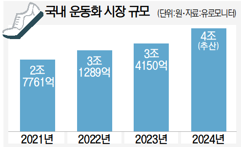 실제 국내 운동화 판매도 빠르게 늘고 있다. 시장 조사기관 유로모니터에 따르면 국내 운동화 시장 규모는 2021년 2조 7761억 원, 2022년 3조 1289억 원, 2023년 3조 4150억 원으로 매년 성장했다. 지난해는 4조 원을 돌파했을 것으로 업계는 추산한다.