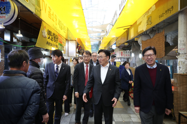 유상임(오른쪽 두 번째) 과학기술정보통신부 장관이 박형준(오른쪽) 부산시장과 함께 20일 오후 부산 반송큰시장을 찾아 소상공인 디지털 민생 지원 방안을 논의했다. 과기정통부 제공