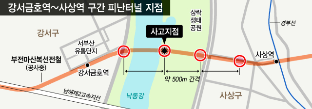 그러나 사고 구간이 복구되더라도 개통까지는 또다른 난관이 있다. 사고 구간에서 사상 쪽으로 500m, 1000m 떨어진 인근 2개 피난터널 공사를 두고 국토교통부와 사업자가 이견을 보이고 있기 때문이다. 애초 설계 계획에 따르면, 대저2동 강서금호역과 사상역 사이 구간에 피난터널 4개가 만들어져야 한다.