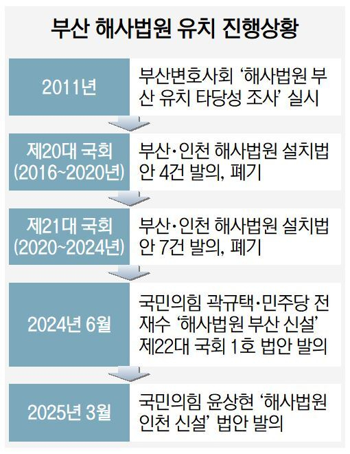 ‘해양 수도’ 부산이 10여 년째 해사법원 유치에 발 벗고 나서고 있지만 관련 법안은 아직 국회 문턱도 넘지 못하고 있다. 여기에 인천시가 자체 고등법원 신설에 이어 해사법원 유치에까지 눈독을 들이면서 부산은 ‘지역 경쟁전’이란 암초에 또 한 번 직면했다. 부산에서 지난 10여 년간 여야가 함께 해사법원 유치를 추진하고 있는 만큼, 이번 국회에서만큼은 초당적인 부산 정치권의 협력으로 결실을 맺어야 한다는 목소리가 커지고 있다.