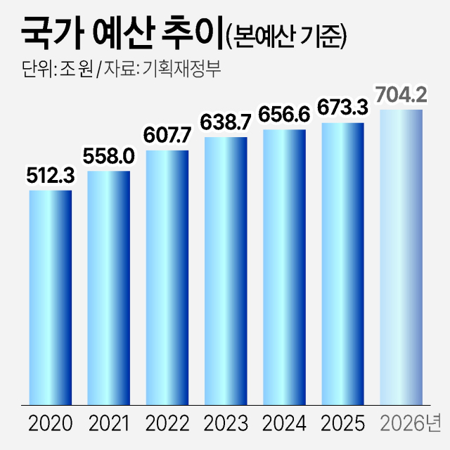 국가 재정 운용계획에 따르면 내년 총지출은 올해 예산(677조 4000억 원)보다 4.0% 증가한 704조 2000억 원에 이를 것으로 보인다. 이에 따라 내년 예산은 사상 처음으로 700조 원을 넘을 전망이다.