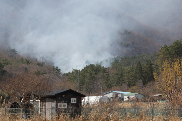 울산시 울주군 온양읍 산불 닷새째인 26일 마을 뒤편 산에서 연기가 피어오르고 있다. 연합뉴스 울산시 울주군 온양읍 산불 닷새째인 26일 마을 뒤편 산에서 연기가 피어오르고 있다. 연합뉴스