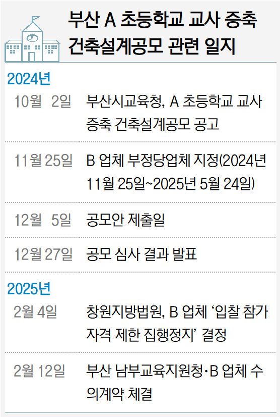 부산시교육청이 부산의 한 초등학교 증축 공사 설계 공모를 진행하며 공모 기간 중 입찰 부적격 판정을 받은 업체와 계약을 진행해 논란이 인다. 시교육청은 선정 업체가 부적격 판정을 받은 사실을 뒤늦게 인지했지만 계약을 강행한 것으로 나타났다. 시교육청이 이후 다른 학교 공사 입찰에서는 공모 기준을 변경해 부적격 업체에 사실상의 특혜를 준 것 아니냐는 비판이 제기된다.