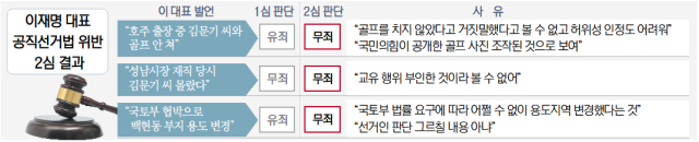 항소심 재판부는 1심에서 유죄가 인정된 ‘김문기와 골프를 치지 않았다’는 발언을 허위 사실 공표에 해당하지 않는다고 봤다. 재판부는 이날 “골프 발언을 ‘김 처장(김문기 전 성남도시개발공사 개발1처장)과 함께 간 해외 출장 중 골프를 안 쳤다’고 해석할 수 없고 허위성을 인정하기도 어렵다”고 밝혔다. 이 대표가 2015년 호주 출장 중 김 전 처장과 찍은 사진에 대해서는 “10명이 한꺼번에 찍은 사진으로 골프를 쳤다는 사실을 뒷받침할 수 없고, 원본 중 일부를 떼 보여줬다는 의미에서 조작된 것이라고 볼 수 있다”고 설명했다.