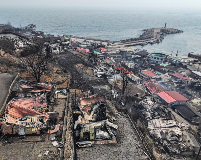 26일 경북 영덕군 영덕읍 노물리 마을이 산불에 폐허가 된 모습을 보이고 있다. 영덕에서는 이번 산불로 인한 사망자가 다수 발생했다. 연합뉴스