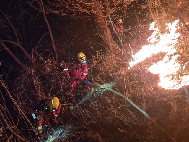 밤새 진화 작업이 펼쳐졌지만 두터운 낙엽층과 산죽으로 인해 진화에 어려움을 겪었다. 산림청 제공 밤새 진화 작업이 펼쳐졌지만 두터운 낙엽층과 산죽으로 인해 진화에 어려움을 겪었다. 산림청 제공