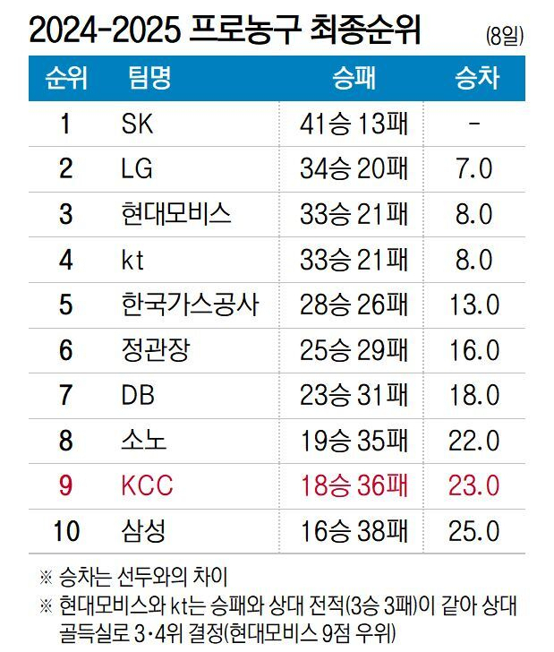 KCC는 올 시즌을 지난해보다 12승이나 적은 18승 36패 승률 0.333으로 마감하며 서울 삼성(16승 38패·승률 0.296)에만 앞선 채 전체 10개 팀 가운데 9위로 올 시즌을 마쳤다.