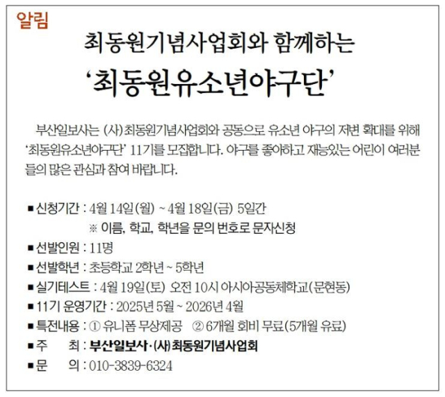 부산일보사는 (사)최동원기념사업회와 공동으로 유소년 야구의 저변 확대를 위해 '최동원유소년야구단' 11기를 모집합니다. 야구를 좋아하고 재능있는 어린이 여러분들의 많은 관심과 참여 바랍니다.