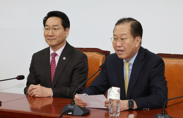 국민의힘 권영세 비상대책위원장(오른쪽)이 14일 국회에서 대선 경선 후보인 유정복 인천시장을 만나 인사한 뒤 발언하고 있다. 연합뉴스