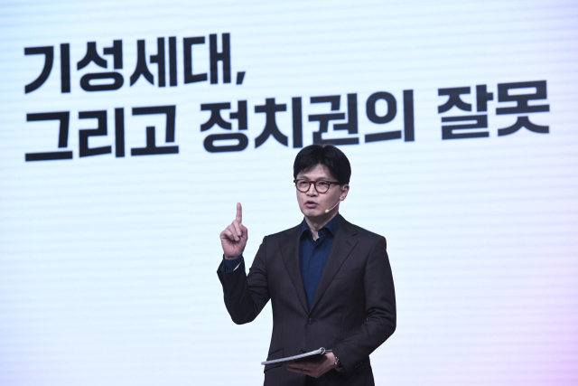국민의힘 한동훈 대선 경선 후보가 18일 서울 강서구 ASSA아트홀에서 열린 국민의힘 '제21대 대통령후보자 1차 경선 비전대회'에서 비전을 발표하고 있다. 연합뉴스