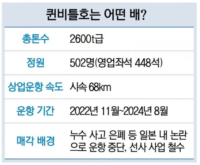 JR큐슈고속선이 호주 조선사에 맡겨 지은 퀸비틀호는 2022년 11월 신규 취항 이후 지난해 8월까지 약 2년간 부산과 후쿠오카를 3시간 40분 만에 연결한 쾌속선이다. 2600t급으로 502명(영업 좌석 448석)을 태울 수 있는 이 배는 동체 3개를 연결한 ‘트라이마란’형으로, 파도에도 흔들림이 적어 운항 중에도 승객이 자유롭게 배 안에서 이동할 수 있는 장점이 있었다.