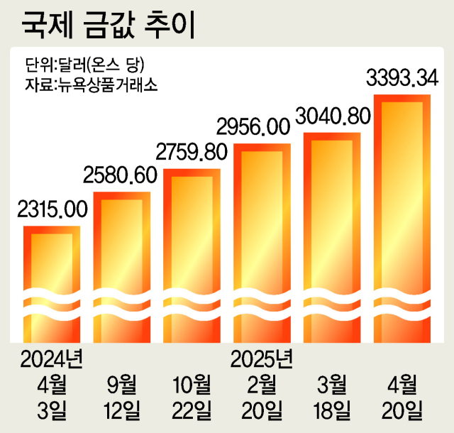 국제 금 가격은 지난달 15일 현물 기준 온스당 3000달러를 첫 돌파한 데 이어 이날 장중 3393.34달러로 사상 최고치를 경신한 뒤 오후 3시 58분 기준 3391.96달러에 거래되고 있다. 하지만 이른바 ‘트럼프 리스크’가 당분간 장기화될 수 있다는 불안감이 시장에 확산하며 금값이 더 오를 것으로 보는 시선이 많아, 앞으로도 금값은 고공행진을 이어갈 가능성이 높다. 실제 글로벌 투자은행(IB) 골드만삭스는 금값이 올해 말까지 3700달러, 내년 중반에는 4000달러까지 이를 수 있다고 내다봤다.