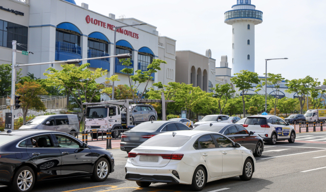 8일 오후 부산 기장군 오시리아 관광단지 내 롯데프리미엄아울렛 인근 도로가 차량들로 정체를 빚고 있다. 김종진 기자 kjj1761@