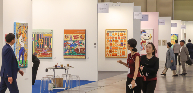 8일 오후 부산 해운대구 벡스코 제1전시장에서 열린 ‘아트부산 2025’ VIP 프리뷰를 찾은 관람객들이 전시를 둘러보고 있다. 이날 VIP 프리뷰를 시작으로 11일까지 열리는 아트부산에는 국내 유명 갤러리를 비롯해 17개국 109개 갤러리가 참여한다. 김종진 기자 kjj1761@