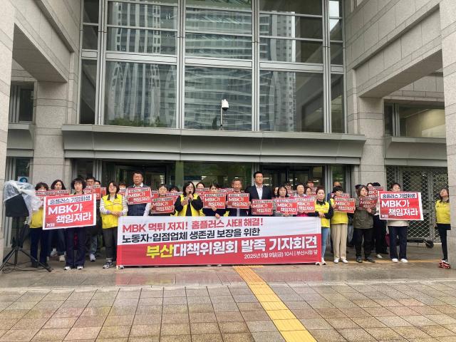 민주노총 서비스연맹 마트산업노동조합은 9일 오전 10시 부산시청 앞 광장에서 ‘부산 지역 공동대책위원회 발족 기자회견’을 열었다고 밝혔다. 이들은 이날 MBK 파트너스가 기업회생 절차를 밟는 것과 관련해 구조조정 위협을 받고 있는 홈플러스 노동자 생존권을 시민단체, 노동조합 등이 모여 공동대책위원회를 결성했다.