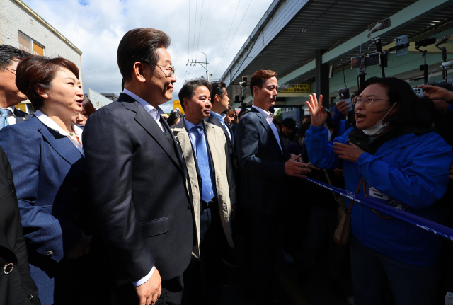 영남 신라벨트 골목골목 경청투어에 나선 더불어민주당 이재명 대선 후보가 10일 경남 창녕군 창녕공설시장에서 지역 주민들의 하소연을 경청하고 있다. 연합뉴스