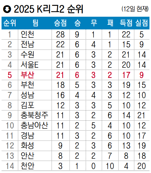 부산은 이날 승리로 안산, 화성, 아산에 이어 청주까지 꺾고 기분 좋은 4연승을 달렸다. 6승 3무 2패(승점 21)를 기록한 부산은 현재 5위를 차지하고 있다. 올 시즌 11경기에서 17득점을 올린 부산은 3위 수원 삼성(21득점)과 4위 서울 이랜드(20득점)와는 승점이 같지만 득점에서 밀려 5위에 머물러 있다. 부산은 2위인 전남(승점 22)과는 불과 승점 1점 차여서 본격적인 선두권 경쟁을 벌일 수 있게 됐다.