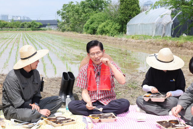 국민의힘 김문수 대선 후보가 21일 경기 고양시 덕양구에서 열린 '고양시 청년농업인 모내기 및 새참간담회' 행사에 참석해 청년농업인들과 도시락을 먹고 있다. 연합뉴스
