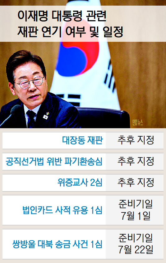 서울중앙지법 형사합의33부(이진관 부장판사)는 이 대통령의 대장동·백현동·위례 개발비리 의혹 및 성남FC 의혹 사건의 공판기일을 “헌법 84조를 적용해 추후 지정했다”고 이날 밝혔다. 당초 이 대통령의 대장동 사건 공판기일은 오는 24일 오전 10시 30분으로 예정돼 있었지만, 이날 서울중앙지법의 발표로 사실상 이 대통령 임기 이후로 연기됐다.