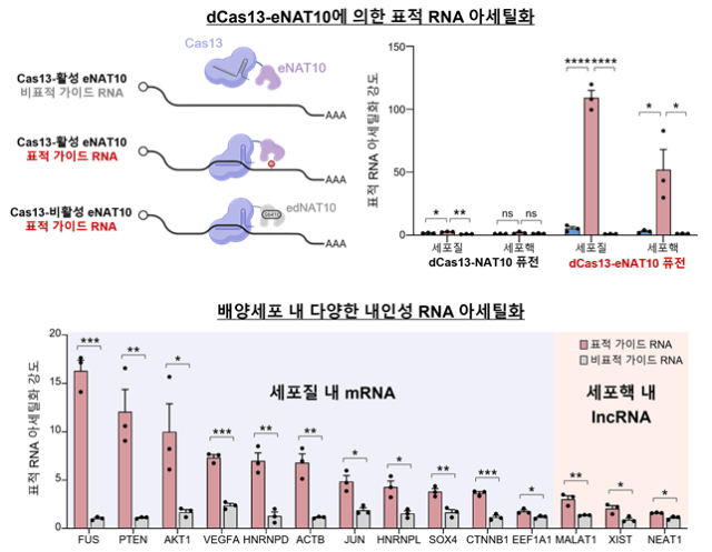 연구팀은 크리스퍼 카스13 유전자 가위(CRISPR-Cas13·카스13 절단 효소를 사용하는 유전자 가위)에 RNA를 아세틸화시키는 변이체(eNAT10)를 결합, 표적 RNA 아세틸화 시스템을 개발했다.