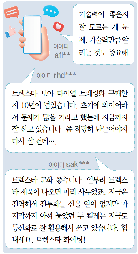 아이디 akwl**은 “트렉스타 화이팅! 성능 좋고 가격은 저렴한 가성비 최고 브랜드로 인식되기를”이라고 응원했다. 아이디 rhd***은 “트렉스타 보아 다이얼 트레킹화 구매한 지 10년이 넘었습니다. 초기에 사람들이 와이어라서 문제가 많을 거라고 했는데 지금까지 잘 신고 있습니다. 차 트렁크에 실어 놓고 있습니다”고 댓글을 남겼다. 아이디 sak***은 “트렉스타 군화 좋은데 최저가 입찰로 우수한 기술 업체가 힘들어 지는 게 안타깝습니다. 아직도 수량은 적지만 꾸준히 고어텍스 소재로 전투화 만들어 주는 트렉스타에게 전 항상 고마움을 느낍니다. 저의 21년 군 생활 중 트렉스타 군화를 만나 15년 동안 발이 편안했습니다”라고 트렉스타 기술력을 칭찬했다.