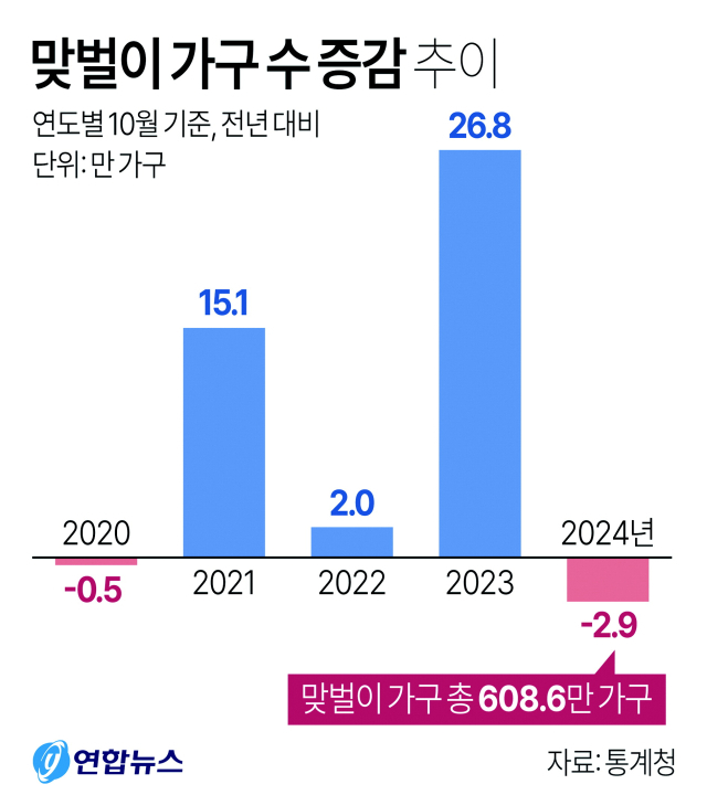 통계청이 19일 발표한 '2024년 하반기 지역별고용조사 맞벌이 가구 및 1인 가구 취업 현황'에 따르면 지난해 10월 기준 전국 유배우 가구(1267만 3000가구) 가운데 맞벌이 가구는 608만 6000가구로, 1년 전보다 2만 9000가구 감소했다. 전체 유배우 가구 대비 맞벌이 가구 비중도 48.0%로 전년보다 0.2%포인트(P) 하락했다.