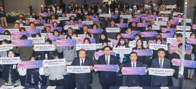지역 사회에서 ‘산업은행 부산 이전’을 요구하는 목소리가 다시 거세지고 있다. 지난 2월 부산상공회의소에서 열린 한국산업은행법 개정 촉구 국회 국민동의청원 출정식에서 참석자들이 구호를 외치고 있다. 김종진 기자 kjj1761@