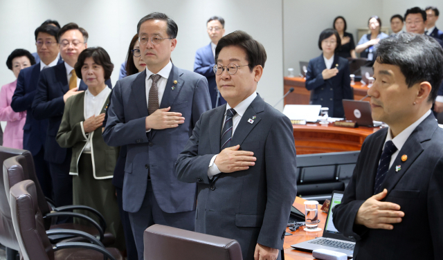 이재명 대통령이 19일 용산 대통령실에서 열린 국무회의에서 국기에 경례하고 있다. 연합뉴스