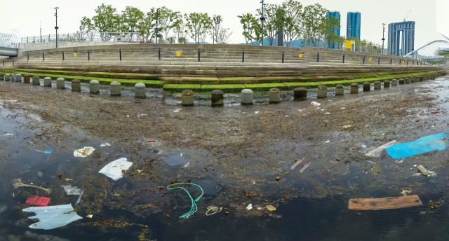 최근 〈부산일보〉 취재진이 찾은 부산 동구 초량동 북항친수공원. 야생화 단지가 조성된 랜드마크 부지와 부산항 힐링 야영장 사이를 지나는 수로인 ‘별빛수로’ 위로 페트병과 비닐, 컵라면 용기 등 각종 생활 쓰레기가 떠다녔다. 여기에 수온이 오르면서 무성히 자란 수초에 쓰레기가 엉키면서 쓰레기는 물에 고인 채 썩어가고 있었다.
