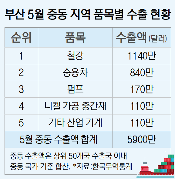 23일 부산시, 한국무역통계 등에 따르면 지난 5월 부산의 중동 지역 수출은 5900만 달러로 전체 수출의 5.2%를 차지하고 있다. 가장 많이 수출된 품목은 철강으로 1140만 달러를 수출했다. 이어 승용차, 펌프, 니켈 가공 중간재, 기타 산업기계 등이 뒤를 이었다. 승용차를 제외하고는 대부분 중간재 품목이다.