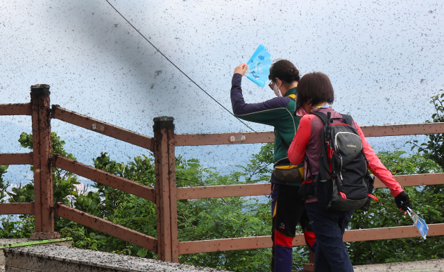 6월 30일 오전 인천 계양구 계양산 정상이 러브버그(붉은등우단털파리)들로 뒤덮여 등산객들이 불편을 겪고 있다. 연합뉴스