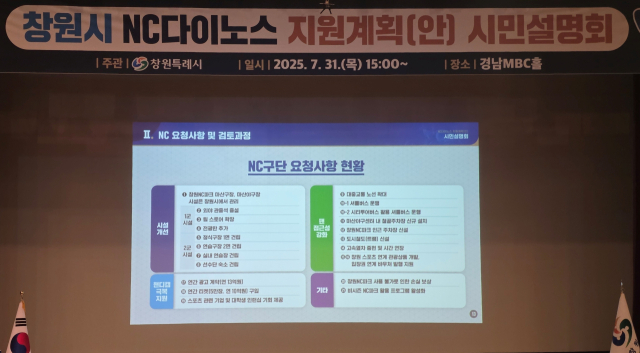 창원시는 31일 마산회원구 경남MBC홀에서 NC 다이노스 지원계획안에 대한 시민 설명회를 개최했다. 지난 5월 말 NC 측에서 연고지 이전을 시사하며 21가지 사항을 요구했다. 이진만 대표이사 명의로 창원시에 발송된 ‘요청 사항 리스트’엔 △시설 개선 분야(8건) △팬 접근성 강화(8건) △핸디캡 극복 분야(3건) △기타(2건)가 담겼다.