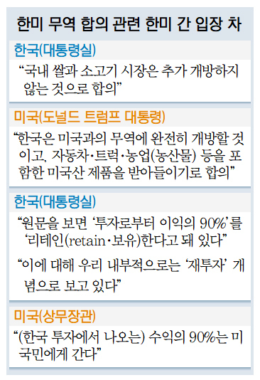 트럼프 미국 대통령은 이날 자신의 SNS 트루스소셜에 “한국은 미국과의 무역에 완전히 개방할 것이고 자동차, 트럭, 농업(농산물) 등을 포함한 미국산 제품을 받아들이기로 합의했다”고 적었다. 그러나 우리 대통령실 김용범 정책실장은 브리핑에서 “국내 쌀과 소고기 시장은 추가 개방하지 않는 것으로 합의했다”고 밝혔다.