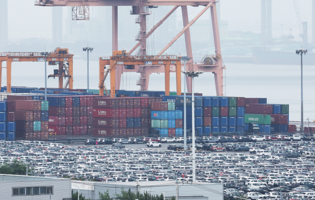지난 7월 1일 경기도 평택항에 쌓여 있는 컨테이너와 세워져 있는 수출용 자동차 모습. 연합뉴스