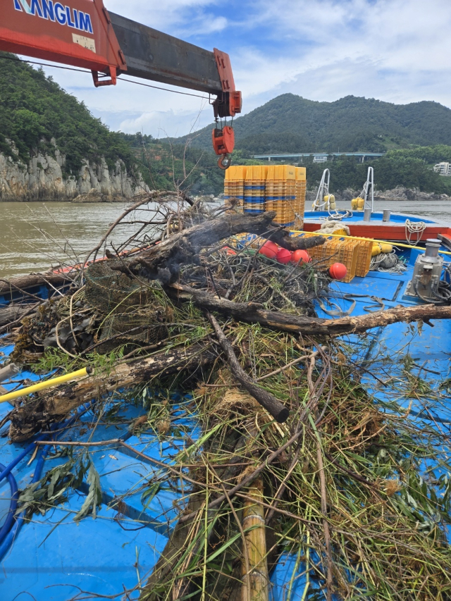 거제시 연안이 지난 집중호우 때 떠밀려 온 각종 해양 쓰레기로 몸살을 앓고 있다. 지역 어민들이 어선을 동원해 쓰레기를 수거하고 있다. 낙동강어업피해대책위원회 제공