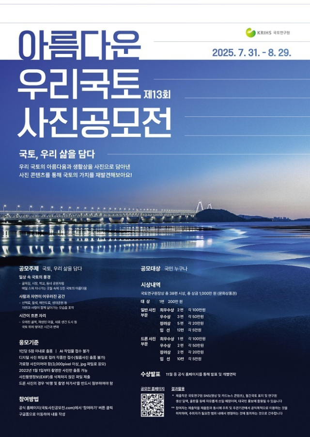 접수 기간은 7월 31일부터 8월 29일까지며 공모전 홈페이지(https://국토사진공모전.com)를 통해 누구나 손쉽게 접수할 수 있다.