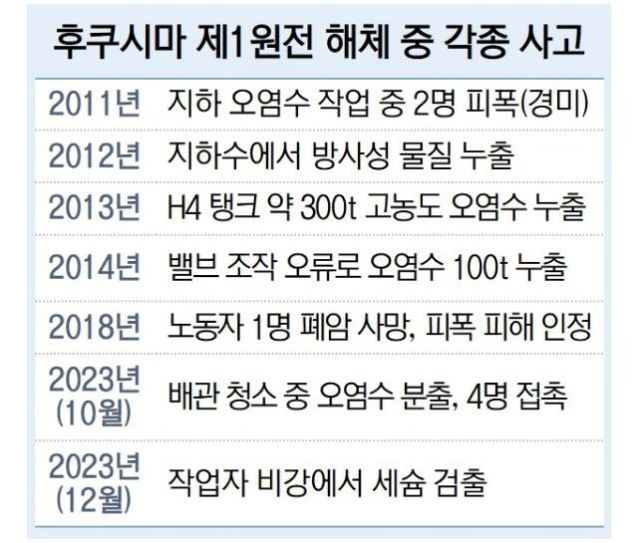 2023년 10월 해체 중인 일본 후쿠시마 제1원전에서 배관 청소 중 방사능 오염 액체가 작업자들에게 튀는 사고가 발생했다. 호스를 분리하다가 배관에 남아 있던 오염수가 분출됐고, 작업자들의 방호 장비 착용도 완벽하지 않았다. 같은 해 12월에도 제1원전 2호기 작업자의 얼굴에서 방사능 물질이 검출됐다. 작업 중 오염 물질에 노출된 것으로 보인다. 다행히 모든 작업자들의 피폭 정도는 가벼웠으나, 해체 작업 중 긴장감이 떨어질 경우 언제든 사고가 일어날 수 있다는 것을 방증한다.